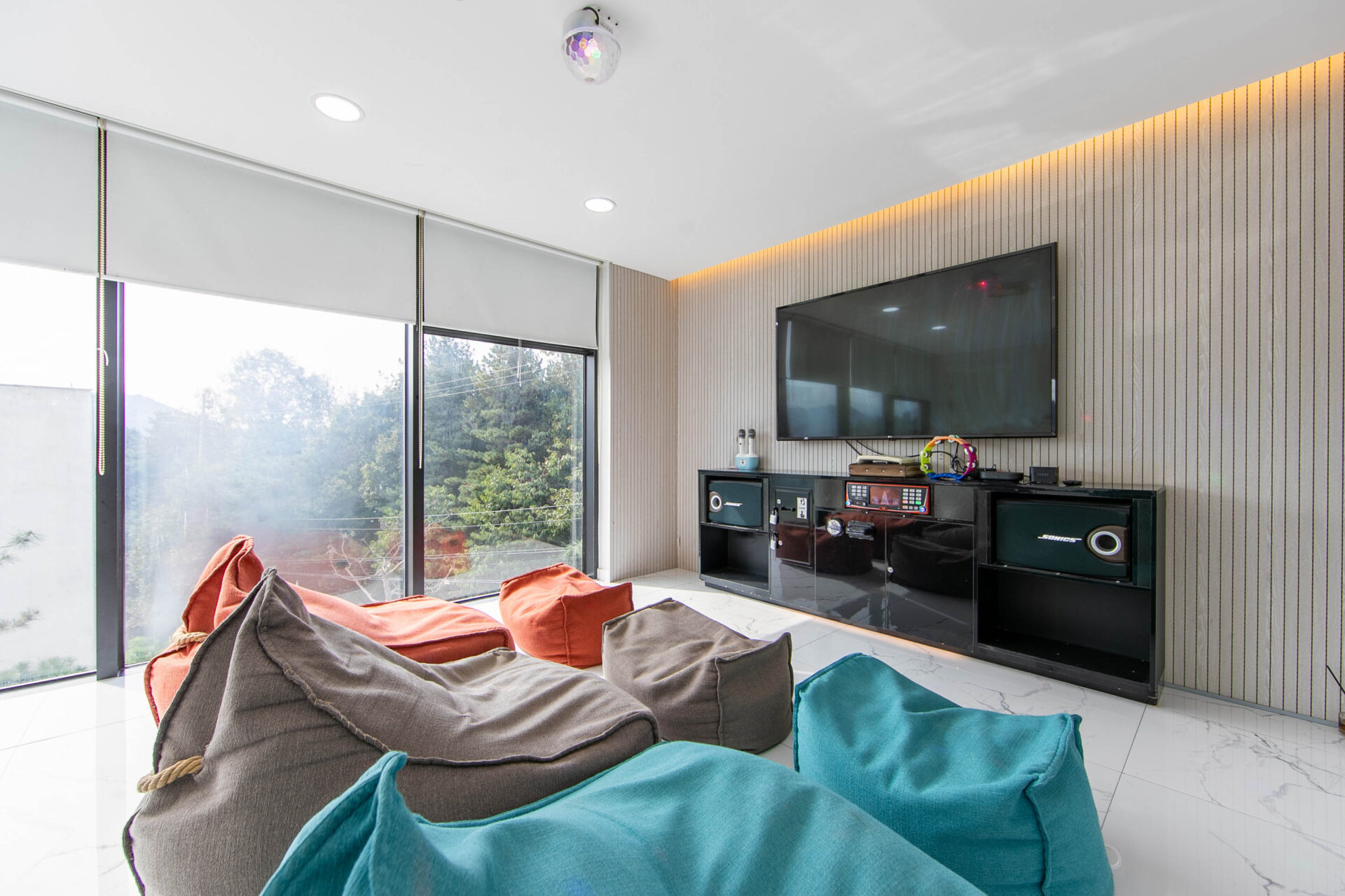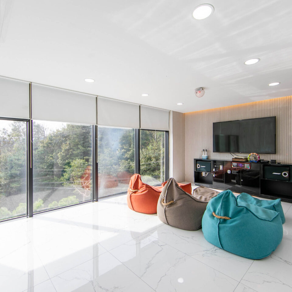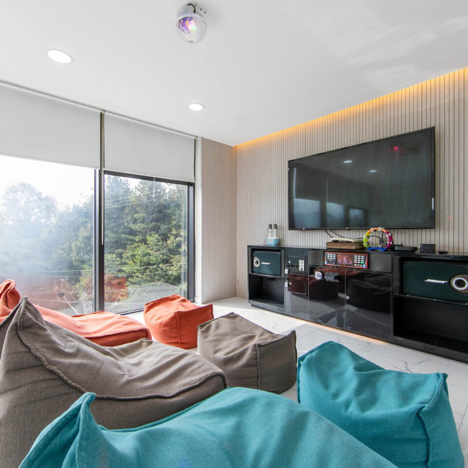 가족이 편안하게 머무를 수 있는 3개의 방과 넓은 거실이 있는 101호 입니다. 영상실/노래방/키즈룸/와인바/침대룸3/욕실 객실배치도1층(거실/수영장/바베큐장)2층(영상실/키즈룸/와인바) 실시간 예약하기 ※ 인원 및 추가 요금 기준 6명~최대 15명 기준 인원 초과시 인당 3만원의 추가요금 ※ 입실·퇴실 안내 입실 15:00 이후 / 퇴실 11:00 이전 ※ 구비시설 영상실/노래방/키즈룸/와인바/침대룸3/욕실 더보기